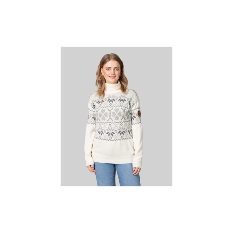 Este suéter de cuello alto para mujer, 100 % lana merino, combina el diseño tradicional noruego con la comodidad moderna. La lana, suave y transpirable, se siente delicada con la piel y regula la temperatura de forma natural, manteniéndote abrigada en climas fríos y cómoda en condiciones más templadas. El cuello alto aporta calidez y un toque elegante, mientras que su corte femenino crea una silueta favorecedora y cómoda. La lana merino absorbe la humedad, es resistente al olor y se puede usar varias veces antes de lavarla: una opción práctica y sostenible tanto para el día a día como para la vida al aire libre. Con su clásico patrón de punto y su característico parche de cuero en la manga, este suéter combina diseño atemporal, calidad y funcionalidad. Disponible en varios colores.
